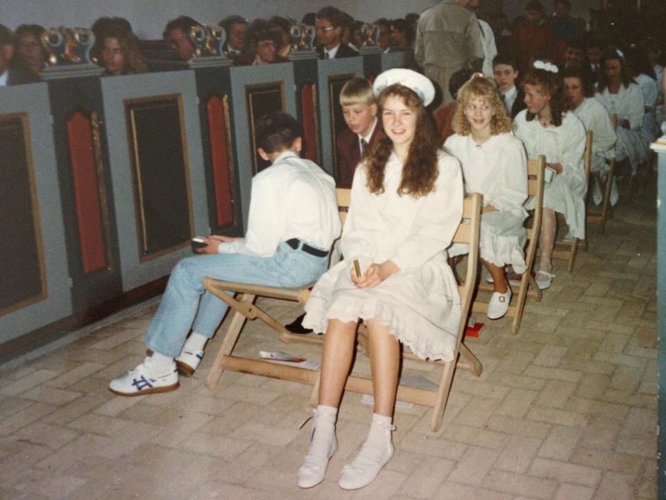 Jeg ejer en total-yndlingsting. Den ældste ting jeg ejer. I hvert fald som jeg selv har købt. Det er jo nok nærmere to ting. For de er et par… eller vi er alle tre et par. Mine rulleskøjter. Mine mega cool Bauer side-by-side med flerfarvede hjul. Jeg fik 2.400 kr. i konfirmationsgave. Hvor jeg iøvrigt var iklædt fuldt matros-outfit. Billedet er nederst. Det er ved at være et par år siden. Jeg brugte ALLE pengene på disse rulleskøjter. Og de har fulgt mig lige siden. De har rullet mange kilometer. Og de har oplevet tøsefnidder i teenageårene. De har oplevet lange udfordrende ture. De har oplevet mig lave mit eget batik-skatertøj med klorin. De har oplevet mig være umoderne. De har oplevet styrt mod en mur. De har oplevet mig græde. De har oplevet mig flyve på ramper. De har oplevet mig juble. De har senere oplevet at flytte med til Aarhus og opleve byen. De har oplevet mig vokse op, og de har oplevet mig vokse lidt fra dem. Men jeg har altid holdt meget af dem, og de er altid flyttet med mig alle steder og har altid haft en plads lige ved hånden – og hjertet. For tænk nu hvis man liiiige fik lyst til at skate. Bare i den sidste måned har jeg flyttet så meget rundt på dem, at jeg ikke har tal på det. Ud i skabet i bryggerset… ejjj der fylder de for børnenes udelegetøj. Ud i udestuen… ejjj nu er jeg hoppet omkring dem alt for mange gange. Tilbage igen til bryggerset – måske er det bedre bare på gulvet… ejjj det dur heller ikke. Vi prøver et andet skab… ejjj så kan støvsugeren ikke være der og må stå på gulvet. What to do? De skal i hvert fald hverken på loftet eller i skuret. Tænk hvis der skete dem noget. Mine babies. Mine Bauer. Som jeg jo i hvert fald ruller på ca. i 10 minutter… om året…