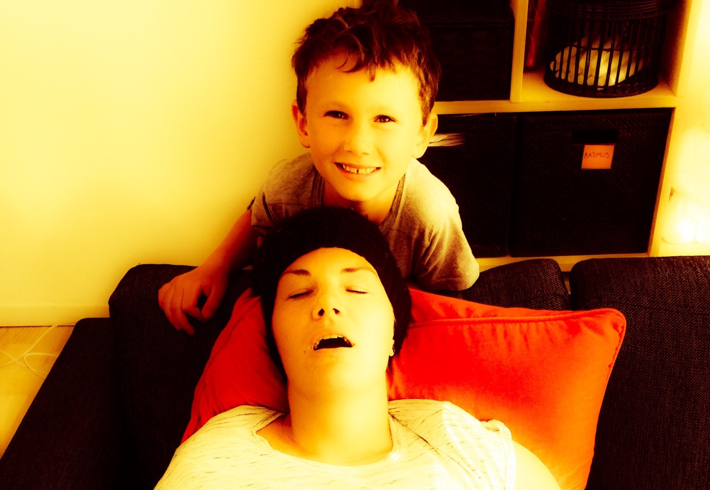 Zzzzzzzz…. sikke en nat. Rasmus (red 6 år) drømte. Voldsomt. Og kunne ikke finde ro. Så efter noget tid kommer han ind til os i soveværelset. Han kommer krybende op i smørhullet. Først. Inden han beslutter, at det er bedre at være fuldstændig klistret op ad mig. På grund af psoriasisgigten så føles hele min ene side som et kæmpemæssigt langt blåt mærke. Jeg har ondt på hele den ene side og kan ikke sove på den side. Og til den anden side er der en væg. Så der ligger jeg så. Jeg har et valg. Fladt på ryggen, stirrende op i loften. Eller på den gode side med krapylet klistret fast på ryggen som en anden urolig abeunge. Og med næsen trykket godt op mod væggen. For selvom sengen er kæmpestor, så har han fået presset mig helt op mod muren. Så meget at min næse var helt kold af at røre muren. Og så er det jo bare at sove.