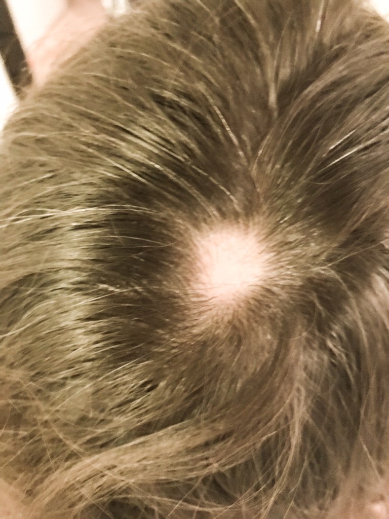 Vi sidder til en fødselsdagsmiddag hos gode venner i går aftes. Jeg kører hånden igennem mit hår. Mit store krøllede hår. Der er den igen. Den irriterende – men umiskendelige glatte plet i min hovedbund.